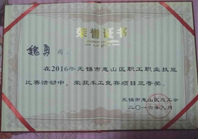 我司總裝車(chē)間顏傳奇、金工車(chē)間魏勇在初賽中脫穎而出,作為陽(yáng)山鎮(zhèn)代表參加此次惠山區(qū)職工職業(yè)技能大賽,并雙雙獲得三等獎(jiǎng)。